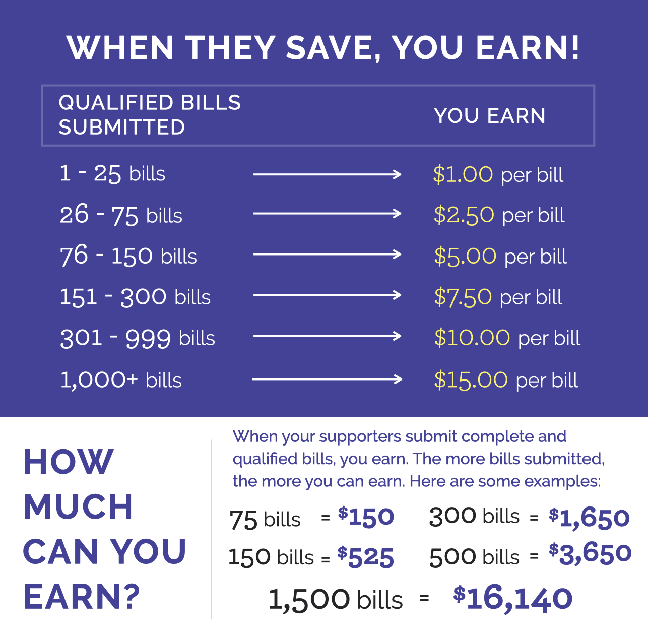 When qualified bills are uploaded, you will earn money for your cause! The more bills uploaded, the more money you will earn. Take a look below to learn how.